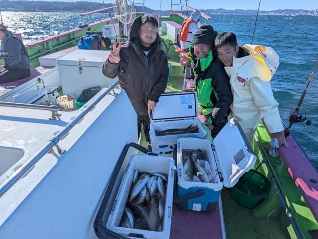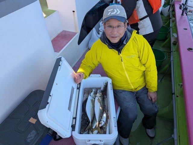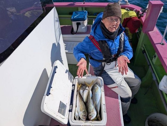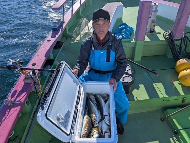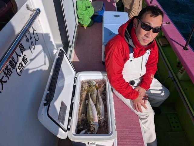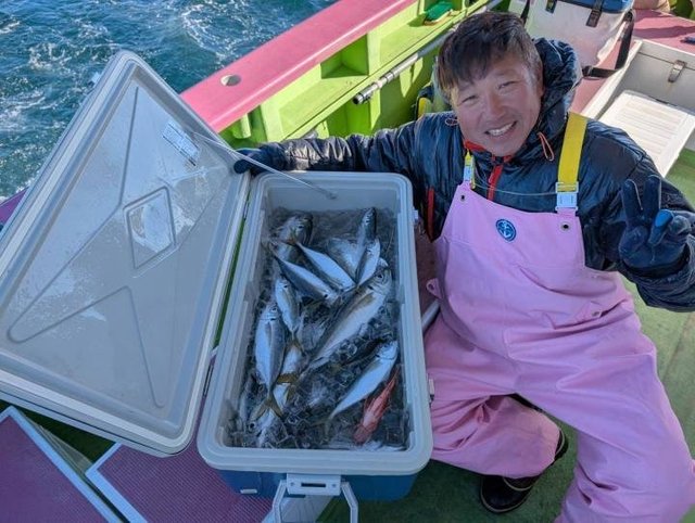 (マアジ)マダイ 0.50~1.00kg 1~3匹 ワラサ 5.30~5.30kg 0~1匹 クロダイ ハタ サバ カワハギ 15~28cm 1~10匹 アカハタ カイワリ イトヨリ マダイ船。 潮色と流れ:澄みゆるい。 風向きと強さ:北西ほどほど→西強い。 波高:0-0.5M→0.5-1.0M。 別船アジの泳がせ竿頭:久慈さん。 別船カワハギ竿頭:原口さん。 いつもご覧いただきありがとうございます! 真鯛トップ3枚、泳がせワラサは5.3kg、カワハギトップ10枚! やや強めの風あり、カワハギ釣りは荒れた天候時にカワハギの活性が上がり、ヒット数が伸びています。水深40-50mにて25cm超えヒット。 真鯛釣りは早朝に活性がよく、1kg前後のサイズが釣れています。魚群の入りはよく真鯛、黒鯛、カイワリ、イトヨリなども釣れていて、魚群は入ってくるため活性が上がることに期待。 フグが仕掛けを食いちぎることもあり、予備は多めにご用意ください(・・;) 泳がせ釣りはアジ・サバなどがヒット。本命は最大5.3kgワラサが食い付きました!