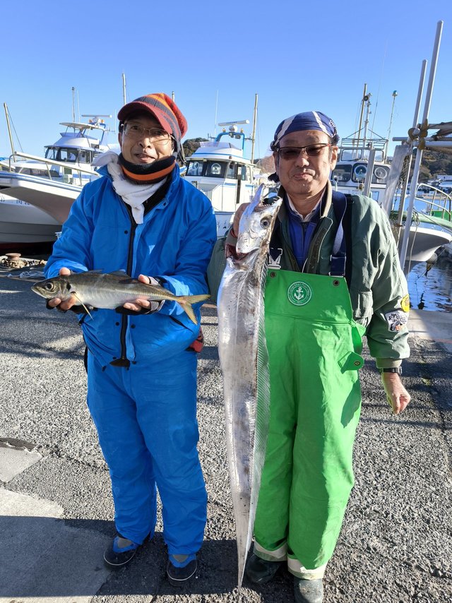 (マアジ)20~32cm 5~23匹 タチウオ 70~110cm 1~21匹 ■タチウオ&アジリレー船■ 〈タチウオ〉天秤/70-110cm/5-21本。テンヤ/1-15本。走水沖70m。走水沖で活性良く、アタリ多く、良型混じりで天秤、テンヤ共に釣れました。 〈アジ〉観音﨑沖60m。小・中・良アジ混じりで、ポツポツ釣れ、おかず確保できました。