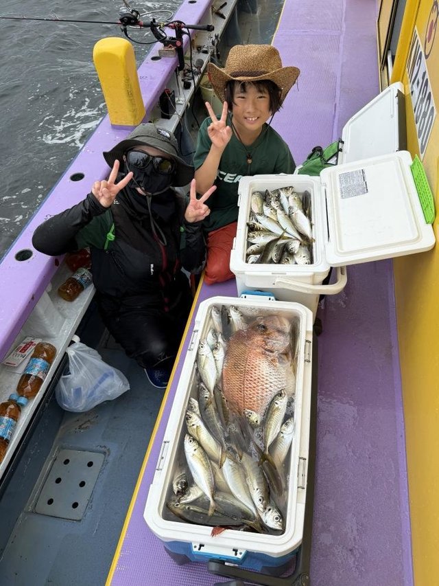 (マアジ)40~60匹 久里浜沖へ出船してきました。天候は曇り、北の風が少し吹く程度で、海は穏やかでした。水深30~70mのポイントを狙い、海水温は26℃、潮は濁り気味でした。一日中、緩やかな上げ潮が続き、アジの食いも安定していました。終日順調にアジがヒットし、時折ダブルで釣れるタイミングもあり、船全体で良い釣果に恵まれました。サイズは食べごろの中型が中心で、皆さんお土産をたっぷり確保できました。本日の竿頭は、浜砂様と喜多様の同数お二人でした。素晴らしい釣果、おめでとうございます!ご乗船いただいた皆様、お疲れ様でした!