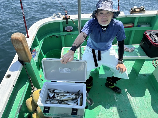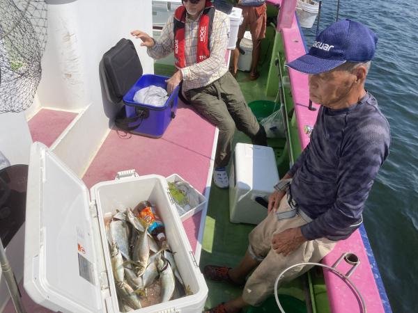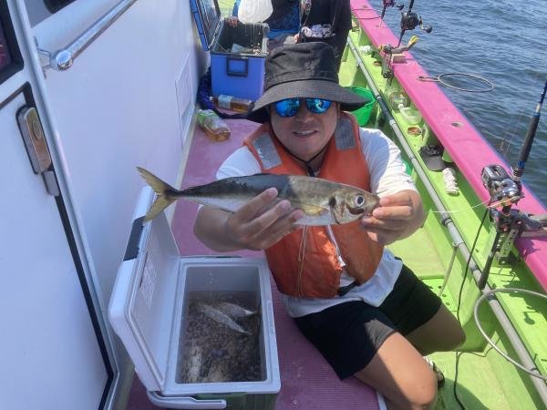 (マアジ)22~38cm 5~22匹 本日の状況ですが、派手な食いはないものの開始からポッツリポッツリと型は見れ良型主体に大型も混じり中盤位までは誰かしらには当たる感じでしたが、その後は当たらなくなり小移動した後に数匹上がるも中々後が続かず数はイマイチ伸びませんでしたが、平均して型は良くお土産になり常連さんだけで皆さん暑さにギブアップで12時で終了しました。…まだまだ暑い日が続いていますので釣行の際は熱中症対策を万全に飲み物も余分に用意してスポーツドリンクもお忘れなく。
