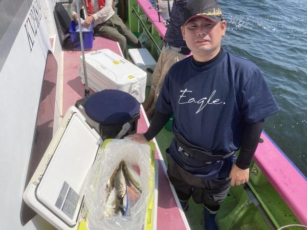 (マアジ)54~75匹 アジが好調!中~大型がポツポツと釣れました!久里浜沖へ行ってきました!海上は南風が弱めに吹く程度で、波も穏やか。絶好の釣り日和です。海水温は26℃、潮は一日を通して緩やかな下げ潮で、うす濁りの潮色が期待感を高めます。魚探に反応が入ると、皆さん一斉に仕掛けを投入。どうやらアジの群れが落ち着かず、せわしなく泳ぎ回っている様子。そこで、タナをこまめに探るようアドバイスすると、すぐに竿がしなり始めました!この日釣れたのは、中型サイズのアジが中心。時折、竿をひったくるような強い引きがあり、上がってきたのは見事な大型アジ!一日を通してポツポツとアタリがあり、最終的には皆さん順調な釣果となりました。ゲストには、高級魚のマトウダイや、なんとトラフグまで!思わぬ大物との出会いも、釣りの醍醐味ですね。今回の竿頭は、見事な腕前を披露してくれた亀谷さん!おめでとうございます!
