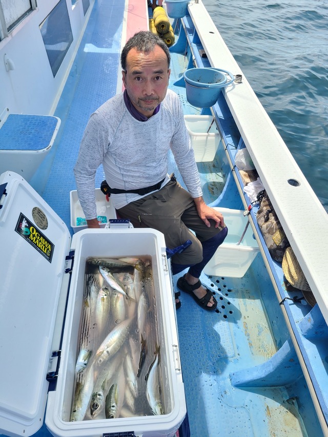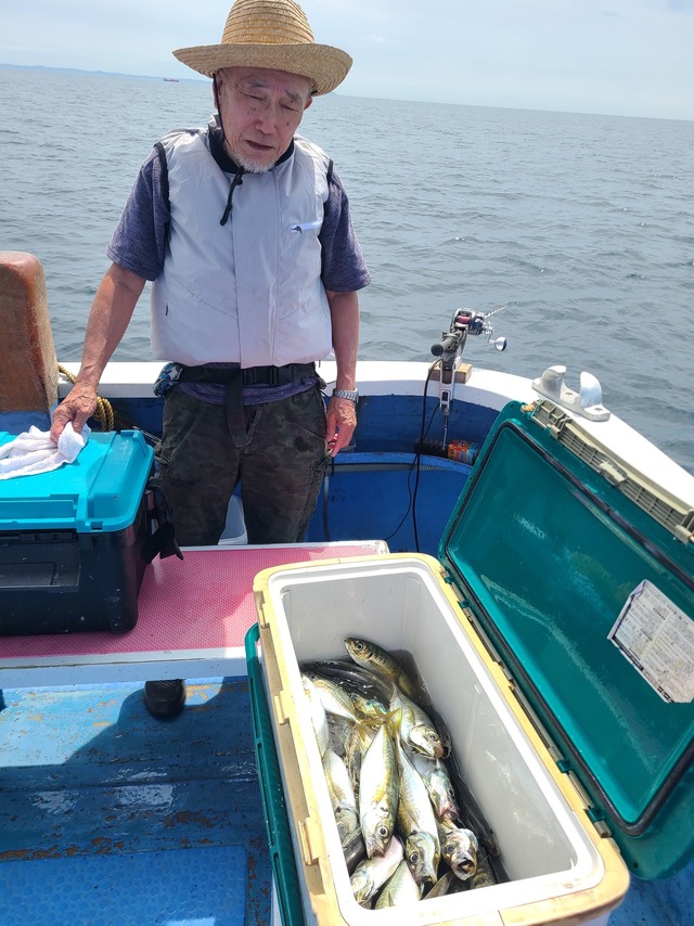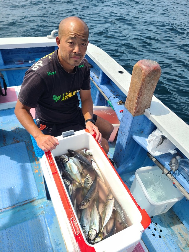 (マアジ)21~50匹 今日は東寄りの弱い風で波も穏やか。いい凪の中、アジ釣りを楽しんできました。水深50~70mで、水温は26°C、潮色は澄み。潮の流れも緩やかで、釣りやすい一日となりました。水深50~70mで反応を探ると、アジの群れが落ち着かない様子でしたが、コンスタントにアタリを拾うことができました。サイズは中型が中心ながら、大型も顔を出し、引き味も楽しめました!潮が澄んでいたため、仕掛けやタナの調整が釣果を分けるポイントになったかもしれませんね。この状況で竿頭の高橋さんは素晴らしい釣果でした!お見事です!