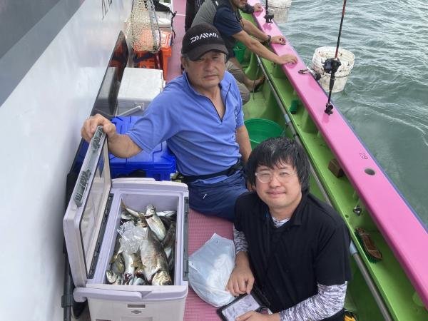 (マアジ)23~40cm 8~38匹 8月13日(火)釣行記 ここ3日ほどは荒天のため休船続きでしたが、本日13日は天気こそ曇りベースながら、逆にそのおかげで厳しい暑さも一段落。風は北の微風、海はベタ凪と絶好の釣り日和となり、久しぶりに出船することができました。 明日14日もこの好天が続く予報ですので、釣行予定の方は安心してお出かけください。アジ五目船、コマセマグロ・カツオ船ともに出船予定です。ぜひお越しください。 アジ五目船の様子 今朝は浅場の根周りからスタート。魚探にはしっかりと反応が出ていたものの、仕掛けを下ろすと予想外に潮が速く、流されてしまい早めの周り直し。 仕掛けを入れ直すと、速い潮は上層だけで、タナを合わせれば十分やれる状況。すぐにアタリを取って中アジを上げる方が出始め、続いてベイトアジ、さらに大アジも混じり始め、何しろ入れ食い状態で釣り上げる方も。しばらくその好調が続き、皆さんしっかりお土産を確保されました。 後半は多彩な魚種を狙いましたが、今日は端物の活性が低く、浅場での泳がせや、深場でのクロムツ・カンコ狙いも顔を見る程度にとどまり、大物は不発に終わってしまいました。 明日からもアジに端物にと、相変わらずバラエティ豊かに狙っていきます。ぜひ期待してお出かけください。