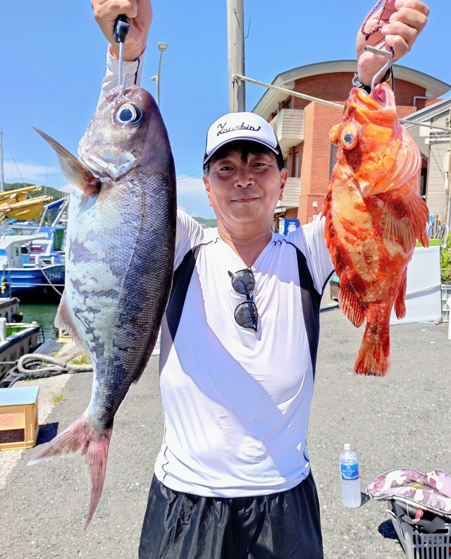 (マアジ)28~40cm 0~21匹 ★7月26日(金)アジ五目釣行レポート:風強まり早上がりも、深場で大アジ好調!★ 今日26日も朝から青空が広がり、気持ちの良い快晴スタート。 朝のうちは南西風も穏やかで、「今日は粘れそうかな?」と期待が高まったのですが……時間が経つにつれ風が次第に強まり、昼前には全船早上がりという残念な展開に。 波も高くなり、船酔いの方も続出。なかなか厳しいコンディションの一日となってしまいました。 そんな中、アジ五目船はまずはいつもの近場の根回りからスタート。 しかし、魚探にはしっかりと反応が出ているにもかかわらず、大アジの顔すら見られない静けさ。 「これはダメだ」と早々に見切りをつけ、深場の根回りへポイント移動。 するとここで状況一変! 仕掛けを下ろしてすぐにアタリが連発し、次々と大アジが上がってきました。 サイズも良型揃いで、ようやくいつもの“本調子”という感じ。 釣りができていた方はしっかりとお土産を確保でき、ホッと一安心でした。 とはいえ、強風と波の影響で体調を崩された方も多く、残念ながら竿を出せなかった方も…。 自然相手とはいえ、船長としては悔しい一日でもありました。 それでも、カンコやアマダイなどのうれしいゲストも交じるなど、魚種は多彩。 明日27日も今日と同じような予報ですが、風の強さは今日よりも落ち着く見込みですので、出船予定の方は安心してお出かけください! 明日もアジ五目船、そしてアコウダイスポット船が出船予定。 早めの勝負がカギになりそうです。 熱中症対策と酔い止めを万全にして、皆さんのご乗船をお待ちしております!