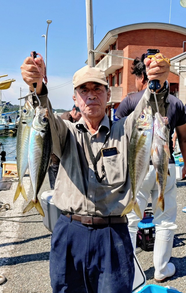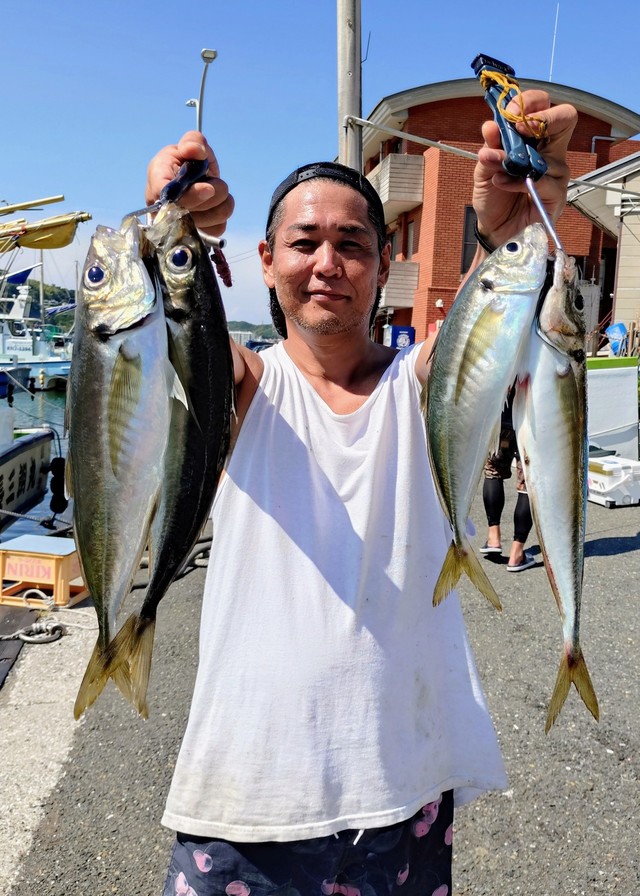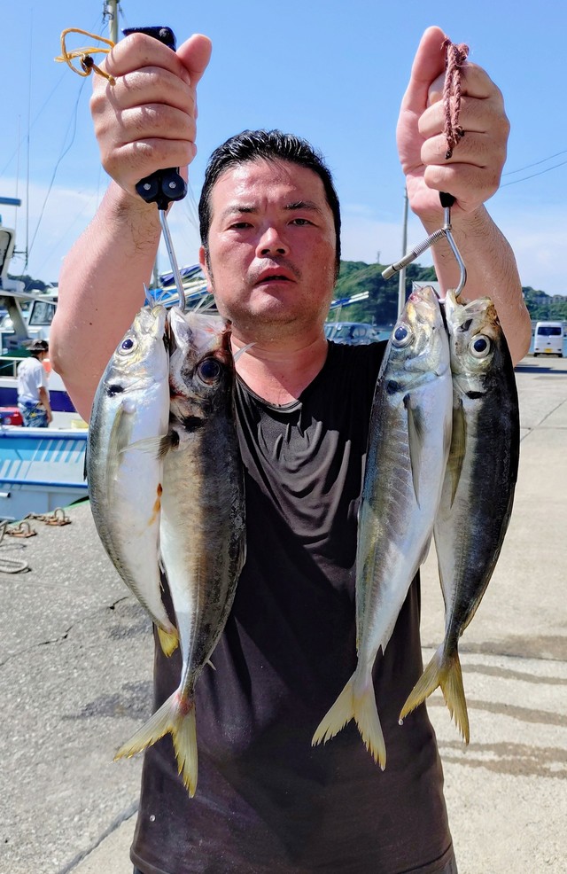 (マアジ)28~40cm 9~28匹 7月23日(火)アジ五目釣行記 真夏の空の下、デカアジ揃い好調&端物も! 今日23日も朝から青空が広がり、空には入道雲がもくもくと立ち上る真夏の空模様。風は昨日に引き続き南西風が次第にやや強まってきましたが、それでも出船には支障なし。絶好調の凪とは言えませんが、まずまずの陽気で無事に出船することができました。 アジ五目船は、今日も近場の根回りからスタート。ところが仕掛けを投入してみると、潮がいつもと逆方向に流れていたせいか、アジの反応は今ひとつ。何度かコマセを撒き直して粘っていると、ようやくポツポツとアタリが出始め、上がってきたのはおなじみのデカアジ! 最初こそ渋い出だしでしたが、時間が経つにつれ徐々に活性が上がってきて、やがては「入れ食いモード」に突入!連続で釣り上げる方も出始め、皆さんしっかりとお土産を確保できました。 その後は沖のポイントへ移動。こちらでは仕掛けを下ろすや否や、すぐにアタリ!一荷で上がる場面も見られ、まさに入れ食い状態。さらに今日はアジに加えてクロムツやカンコなどの端物も混じり、クーラーの中はバリエーション豊かな釣果に。 この時期になると、昨年もワラサの気配がちらほら出始めた頃です。今年もそろそろそんな端物の回遊に期待が高まります! 明日24日(水)も天気は引き続き晴れ予報。風は今日よりも落ち着いてくる見込みなので、釣行予定の方は安心してお出かけください。 アジ五目船、そして根魚五目キンメ・クロムツ船で出船予定です。ぜひ夏の海へ、お土産たっぷりの釣りを楽しみにいらしてください!