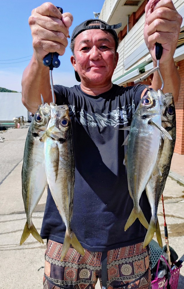 23~42cm 4~53匹 大津沖でやり前半は、ころっとした中アジ主体! デカアジも混じり ポツン~ポツンと皆さん見れて楽しめました。 後半は潮も速くなり 棚が合う方はポチポチと見れましたが 棚取りの難しいアジでしたね。 竿頭53匹、2番手41匹、3番手35匹の結果で フルレンタルのお客様も 潮の速い中頑張って頂き 4~16匹と型が良かったので助かりました。 また皆さんで遊びに来て下さい。 明日もお付き合い、ご予約お待ちしてます。 勝司船長
