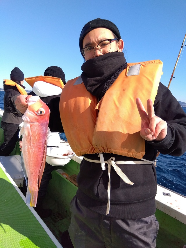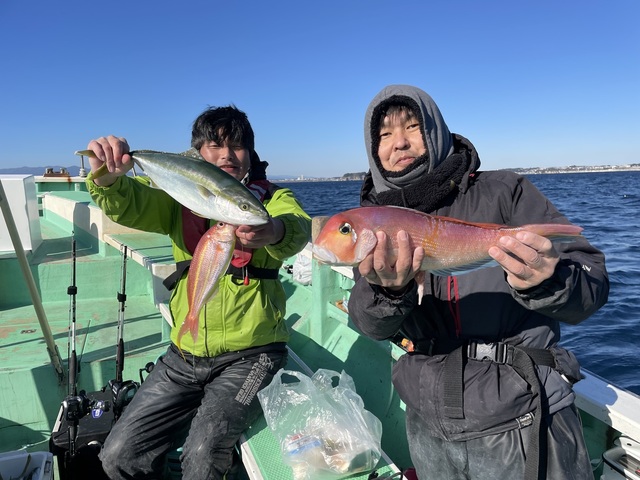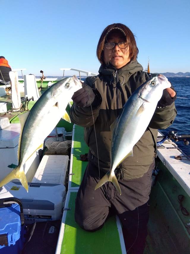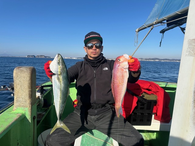 (ブリ)ソーダ キントキ マダイ ハナダイ ホウボウ イトヨリ カナガシラ レンコダイ 今日もご乗船有り難う御座いました。 今日は海が悪くの中出船させて頂きました。 イナダは今日も順調船中60本位途中船酔い我慢し釣りしてた方々ギブアップでさらにの数上がらずバラシも多々あり45〜55cm2〜8本他マダイ1.4k大ソーダキントキハナダイ 後のアマダイ釣り苦戦し時間前一発シロアマダイでもと42mを流し落とし込み即大型シロアマあたりましたが残念ハリス切れ。。23〜30cm0〜1枚でしたがホウボウ0〜3本、イトヨリ0〜3枚、カナガシラ、レンコダイ、ヒメコダイゲストは色々 別船乗合は朝シマシマ釣りからのアマダイ釣り49cm47cm43cm40オーバー3枚ゲット!自分が帰港した時にはお客様港外に記念写真撮れず。 今年も一年皆さんお世話になりました感謝です。 来年も宜しくお願いいたします。 良い年をお迎えください!