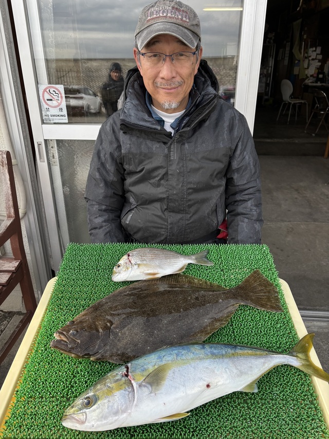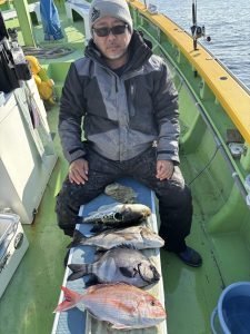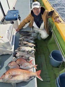 クロダイ 2~6匹 マダイ 0~2匹 ハナダイ アジ ヒラメ 第2優神丸はコマセ五目。 潮が春の濁り潮になったのでまずはクロダイを狙いました。 ポツポツ当たり、5名で2〜6枚。 バラシ、ハリス切れもありました。 その後、他の漁礁を流しマダイ0〜2枚、ハナダイ、イシダイ等も釣れました。 アジが釣れだすとヒラメもゲット。 今日は出来過ぎの一日でした。