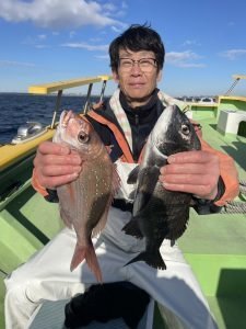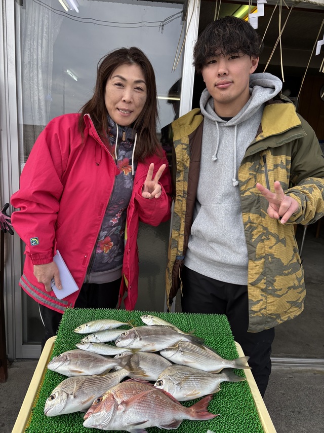 マダイ 最大0.40kg 0~1匹 クロダイ メジナ イサキ 1号船タイ五目です。今日はマダイは小型を 見ただけでした。 しかし メジナの喰いは良く 全員沢山釣れて お土産になりました。 他には 黒ダイに小型のイシダイです。 今日は釣れませんでしたが なかなか良い反応が 出てる場所もあったので 今日は今日 明日は明日だから 色々と当たりが出るかもよ〜。 保険にメジナ君が釣れるので 助かるねぇ〜〜。 ほんとっ!! メジナは反応てんこ盛りだから 全然まだまだ釣れると思うよ〜。