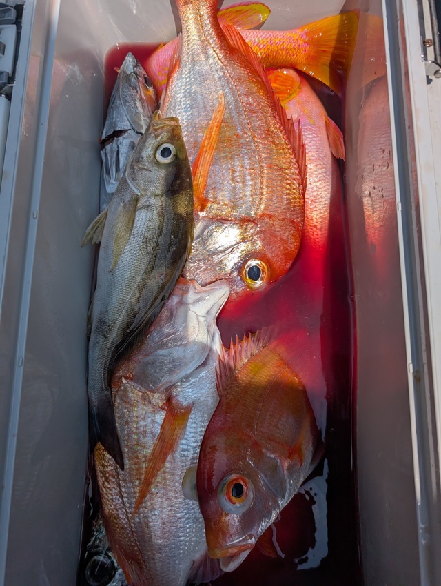 マダイ 最大1.00kg 0~1匹 ハナダイ クロダイ アジ イトヨリ 10号タイ五目です。本日はマダイの顔見れました。 場所を転々としてなんとか色々と拾いタイ五目になりました。 徐々にマダイが出てきましたね。 本日もご乗船ありがとうございました