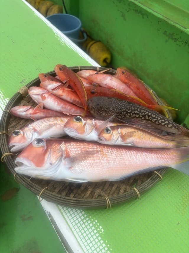 (キダイ)アマダイ 23~40cm 1~3匹 ヒメコダイ アラ オニカサゴ イトヨリダイ アマダイ五目船。 今日は朝のうちサイズいいのがババン!おぉ!!!今日はまさかー???いい感じかー???、、、、、、皆まで言うまい(›´-`‹)笑 深い方も行きましたけど上潮は流れてるんですけど下の潮があまり流れてなく、俗にいうやりづらい海でした(›´-`‹) お昼回って浅い方に戻ってきてポチポチ顔みて終了ーーって感じの日でございましたヽ(`Д´)ノ