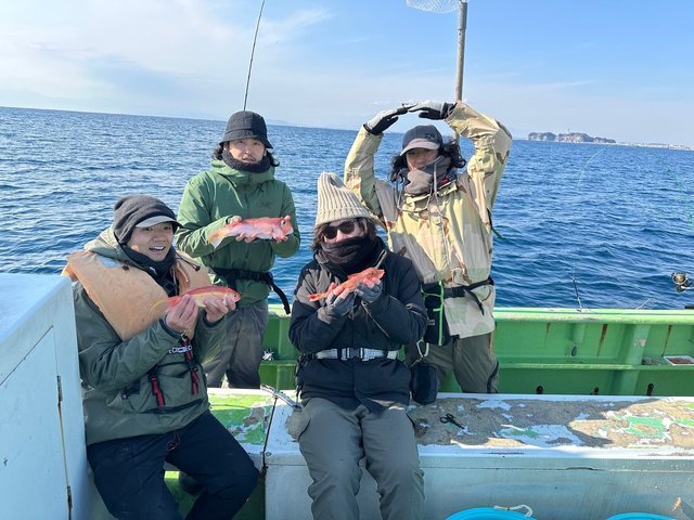 (アカアマダイ)28~36cm 竿頭9匹 カサゴ アカボラ 2号船釣果☆ 本日はアマダイとタイラバ船で出船しました。 天候晴れ。 アマダイ、28cm〜36cm、 一人9匹。 カサゴ、赤ボラ、 タイラバ、 アマダイ、1匹。 赤ボラ、カサゴ。 全体的に厳しい1日となりましたがアマダイは良い結果を出す事が出来ました。 本日も冷たい陽気の中ご来店頂き誠にありがとうございました。