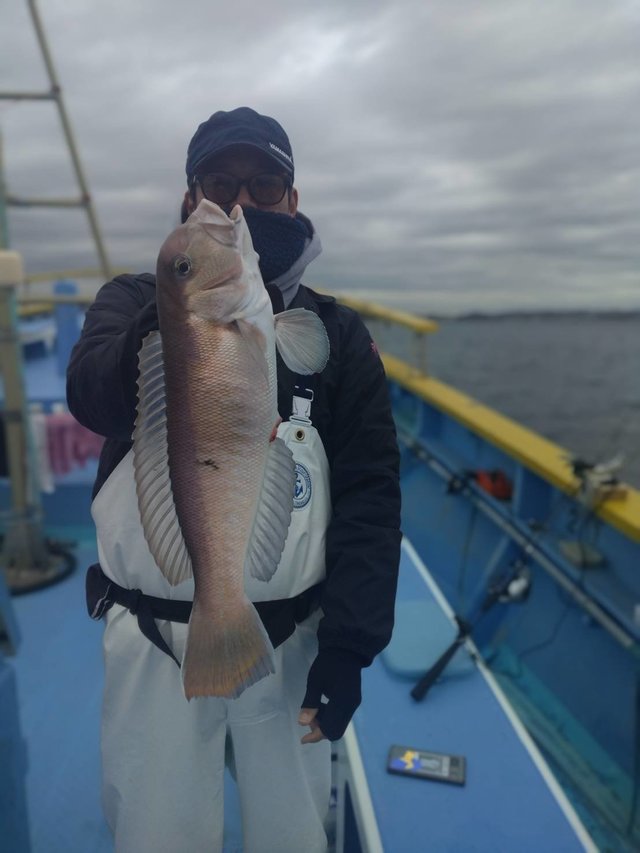 (アカアマダイ)28~49cm 3~3匹 イトヨリダイ アマダイ五目船。 ヒラタさんのお連れさん(*^^*)白アマダイ49センチ!!ご立派でごやす(´∀`)b ヒラタさんも3匹、お連れさんも3匹(*^^*) 水深見てもらっての通り今日は浅場メインというか、北風強すぎて浅場をやらざるをえなかったって感じ( ̄▽ ̄;)大きいの出てくれたから良かったですけどね、結果オーライ(*^^*)