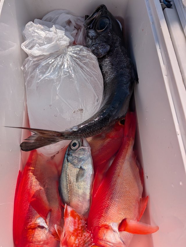 【仕立中深海・マダイリレー】 中深海から開始!朝のうちはアタリポツリポツリと拾えました😅 しかしだんだんとアタリが乏しくなってしまいました😥 後半マダイの方は何箇所か回ってみましたが、なかなか当たりがない中ようやくアタリがあったもののハズレてしまいました😓 それでも他の外道でクーラーはいろいろつれましたよ。 明日から風の予報ですが、明日は朝は良さそうなのでできるとこまで頑張ります。 本日もご乗船いただきありがとうございました。 またのお越し心よりお待ちしております。