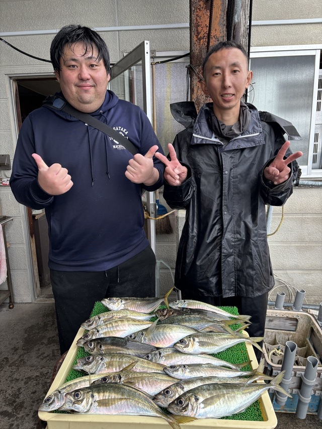 (マアジ)21~40cm 16~55匹 3号船アジ船です。本日はアジ船で出船致しました。 本日のアジ船は初心者様も多く。 天気予報も悪くはや上がりの予想だったのでアタリ重視!! 朝の一投目からアタリあり!! 1日通してポツポツと釣れ続けました。 途中途中で反応は出入りしましたが、船下に戻ってくるとまたポツポツ。 平均で30尾前後、トップは55尾!! 皆様に満足して頂けましたよ。 南風と悪天候で今日は13時ではや上がり! 帰り際までアタリ続いたので今後も期待です。