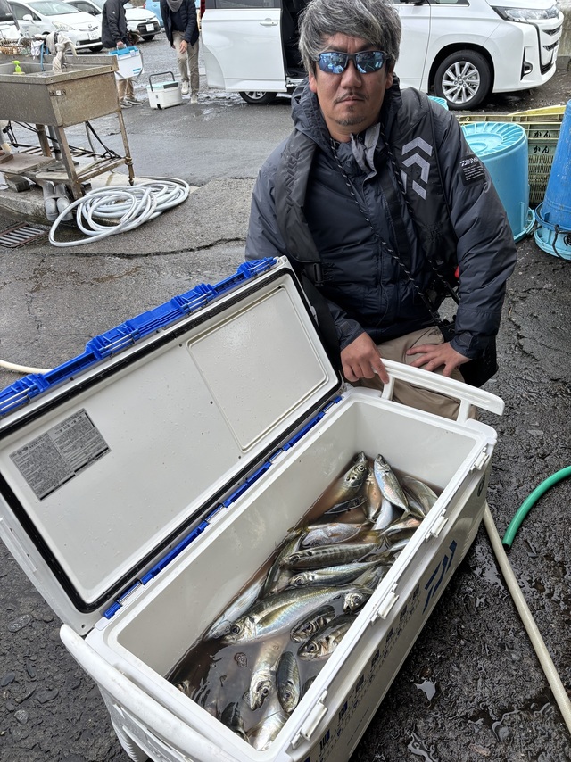 (マアジ)15~38cm 50~62匹 ビシアジ船。 本日は2名様での出船! 手返し良く釣れるお客様でしたので、お二人様でも反応止まりバリポッっと釣れました! 型も良くお昼過ぎにクーラー賑やか!雨、風共に強くなりましたのでお客様ご希望で早目に上がりました! 明日も爆烈募集中です!