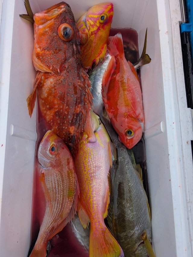(マアジ)カサゴ アカハタ メバル 今日は釣り船に出ました。 カサゴ、コマセ五目リレーです。 前半カサゴ狙い。カサゴにアカハタなど、、アタリ良好。 小型は放流いただきありがとうございます。 コマセ五目はやや深い所で良型のアジにあたりました。 今日はリレーがうまくいきました。