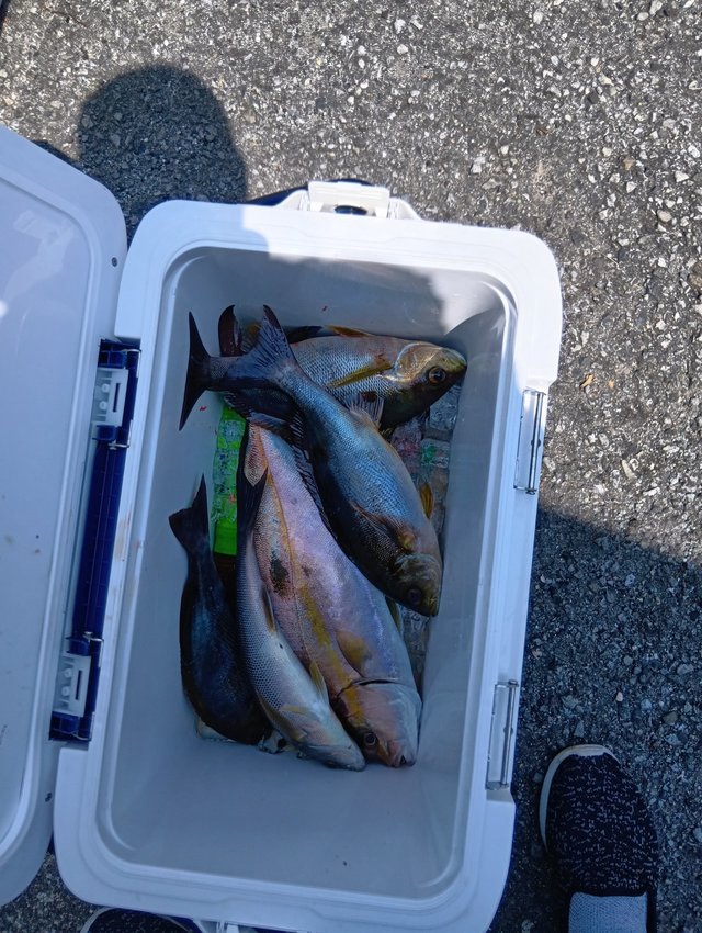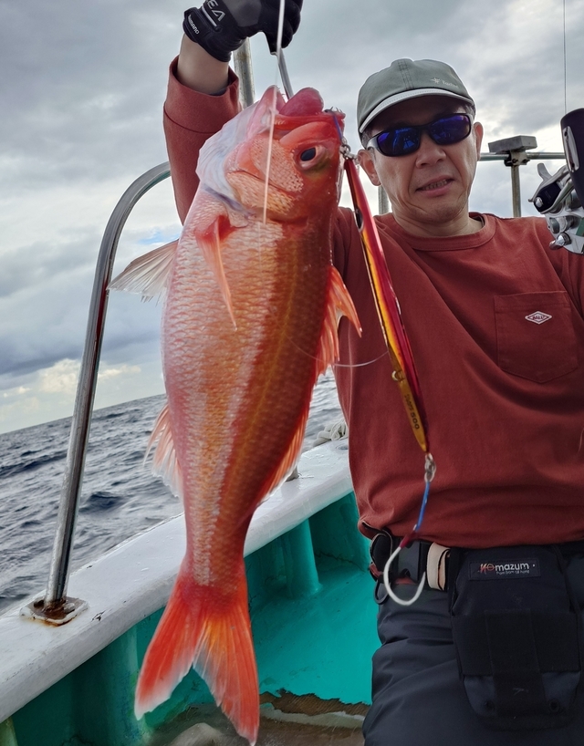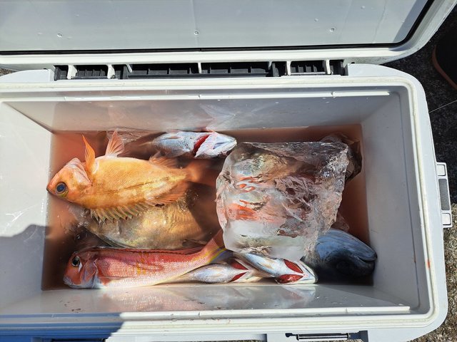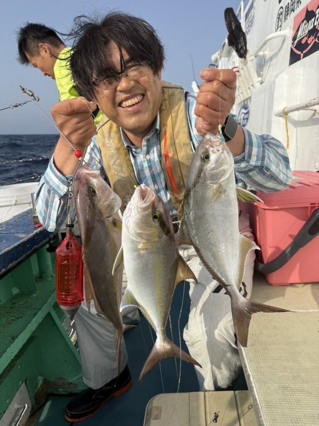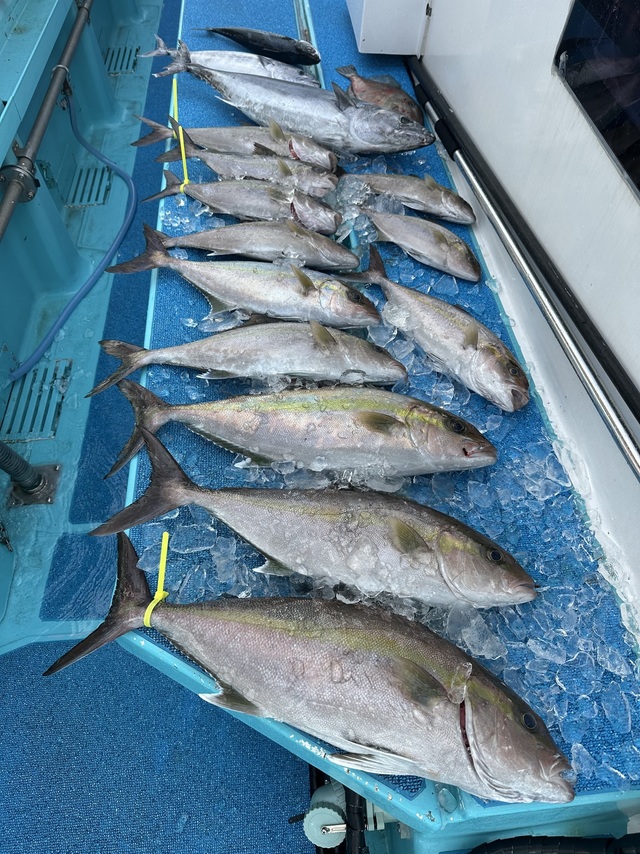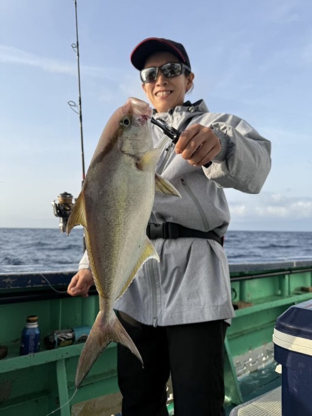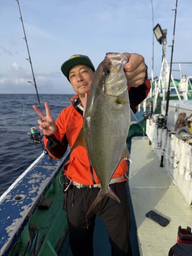 1.80~9.10kg 0~3匹 キンメダイ 0.50~0.80kg 30~50匹 スマガツオ ヒレナガカンパチ ウメイロ 21号船、キンメ船。 キンメダイ、0.5kg〜0.8kg、30枚〜50枚。 23号、銭洲船。 カンパチ、1.8kg〜9.1kg、0〜3本、船中9本うちルアー5本リリース3本。 バラシ餌抜かれあり。その他特大スマガツオ。 ウメイロ頭10匹程度。 今日も2隻出船しました! キンメ船の方はポツポツ型拾えて皆さんお土産十分でした!!連日好調キープです。 銭洲船は餌抜かれやられ多発です。当たりは多くありましたが中々数伸びず難しかったです。 明日も頑張ります!! キンメ船、キハダ船、銭洲船エサとルアー共に空きありますのでぜひ時間ある方スケジュール表確認の上よろしくお願いします。その他近場でのシマアジ釣りなどリクエストあれば人数集まり次第出船します、お問い合わせください。
