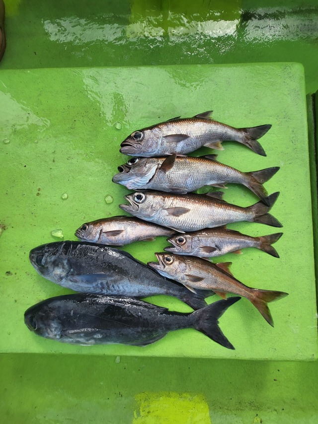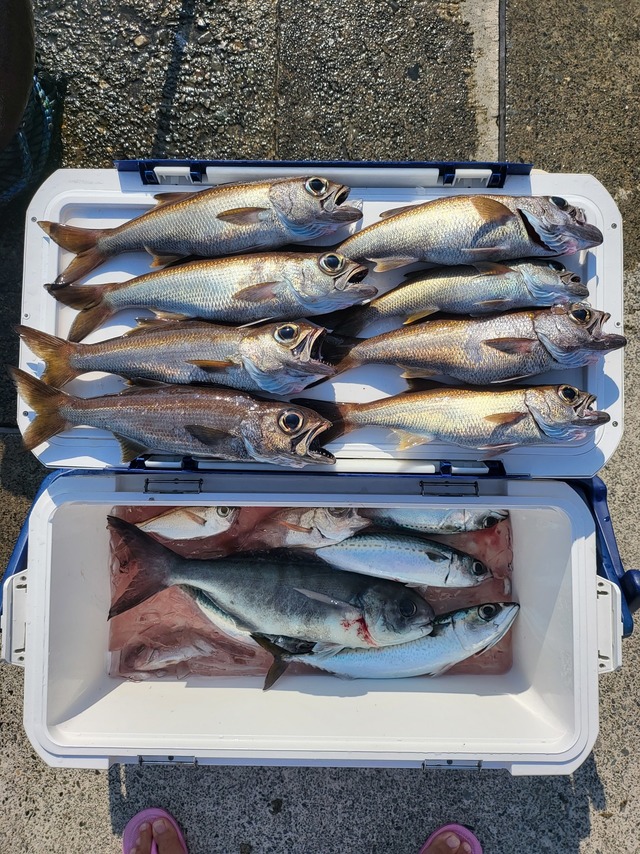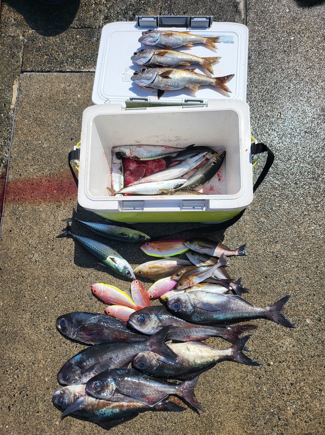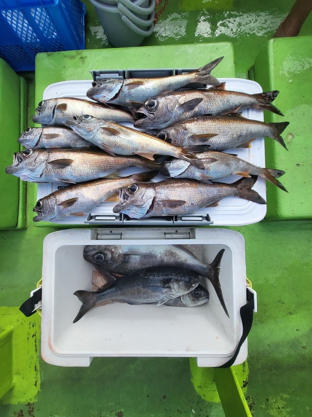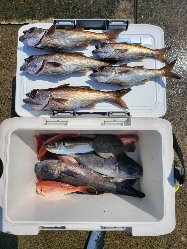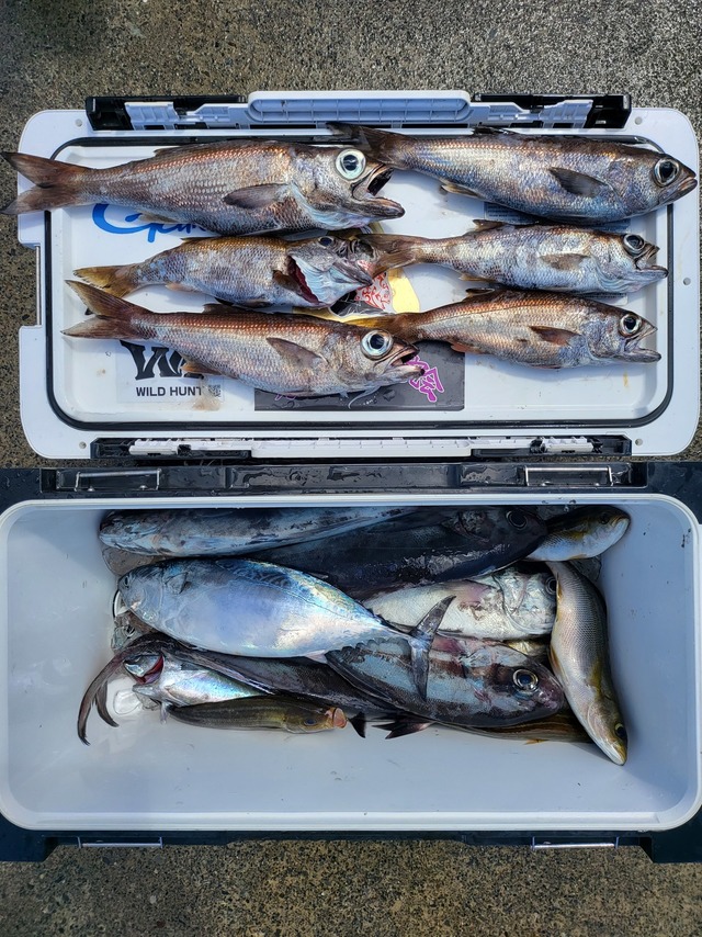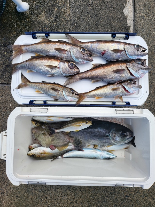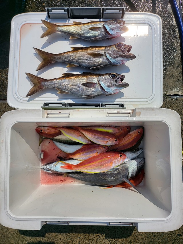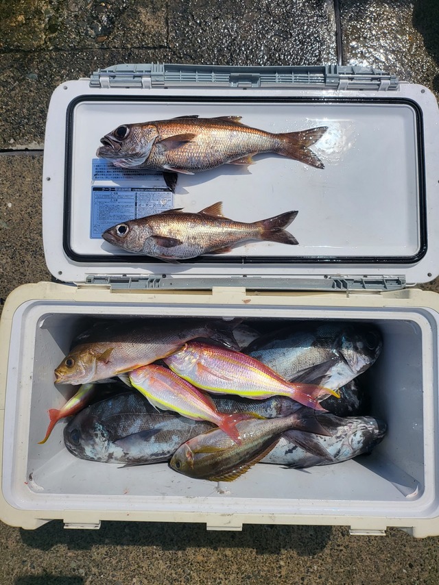 1.00~2.10kg 合計2匹 キンメダイ 0.40~1.00kg 11~38匹 カンパチ 2.20~6.80kg 0~5匹 キハダ 15.00~30.00kg 合計2匹 銭洲泳がせ&ルアー別船キンメ船 21号船キンメ釣り キンメダイ0.4kg〜1.0kg11枚〜38枚 クロムツ1.0kg~2.1kg船中2枚 今日はキンメ船当たり良かったです! 毎日違うので今後もチャンスありですね オールレンタルも好評ですのでよろしくお願いします 23号船銭洲 カンパチ2.2kg〜6.8kg0〜5本船中10本うちルアー5本リリース1本 キハダワタヌキ15kg〜30kg船中2本 今日も銭洲でした!中ムロ多く取れました! 泳がせダブルヒットもありましたが後が続かず型拾いでした、ルアーはポツポツと当たり5本!サイズは少し小ぶりでしたが好調キープです キハダもトップでゲット!泳がせでも釣れました 他餌抜かれやられもありました、反応はあります!また次も頑張ります!