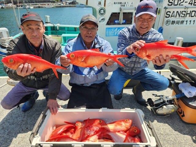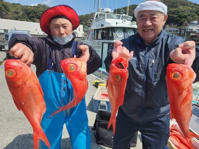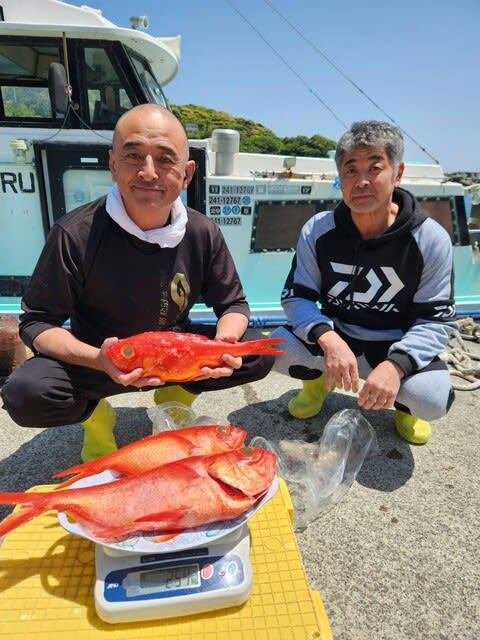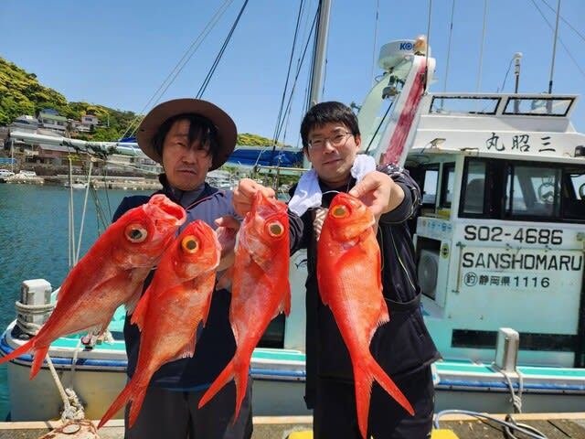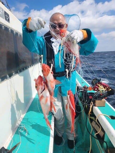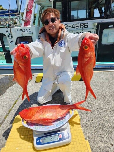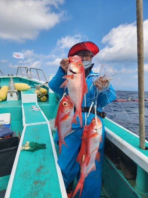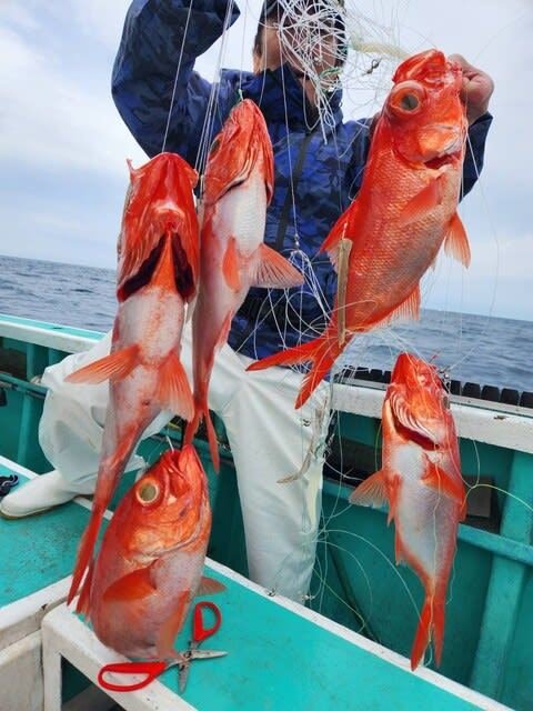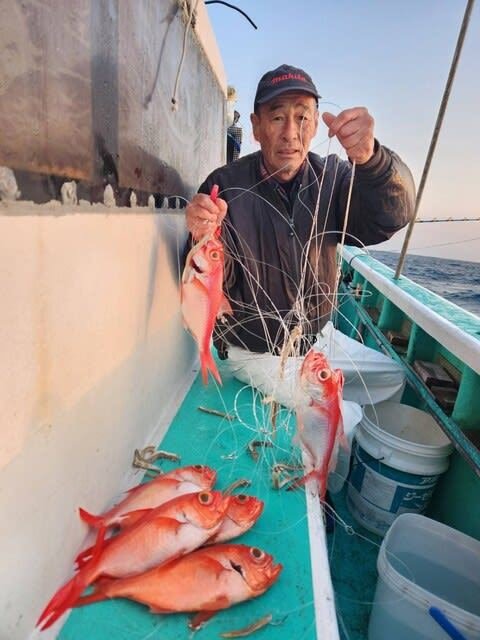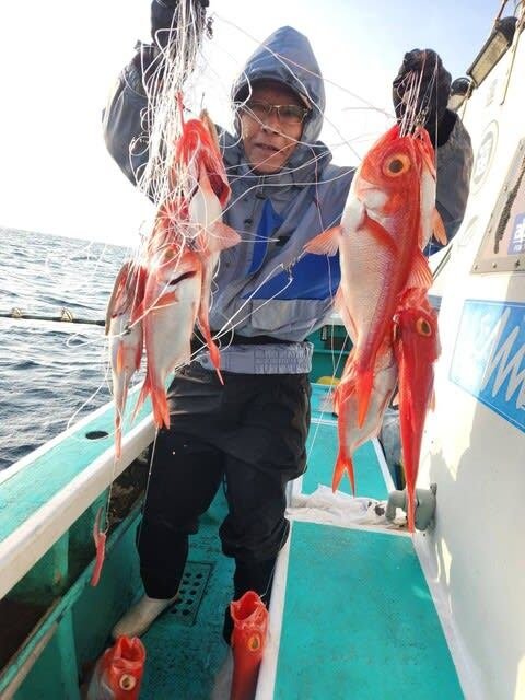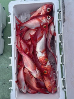(キンメダイ)新島キンメ釣果。天候に恵まれ出船しました。朝は喰い渋りでしたが…後半には多点掛けもあり、皆さん好調に釣れてます。
