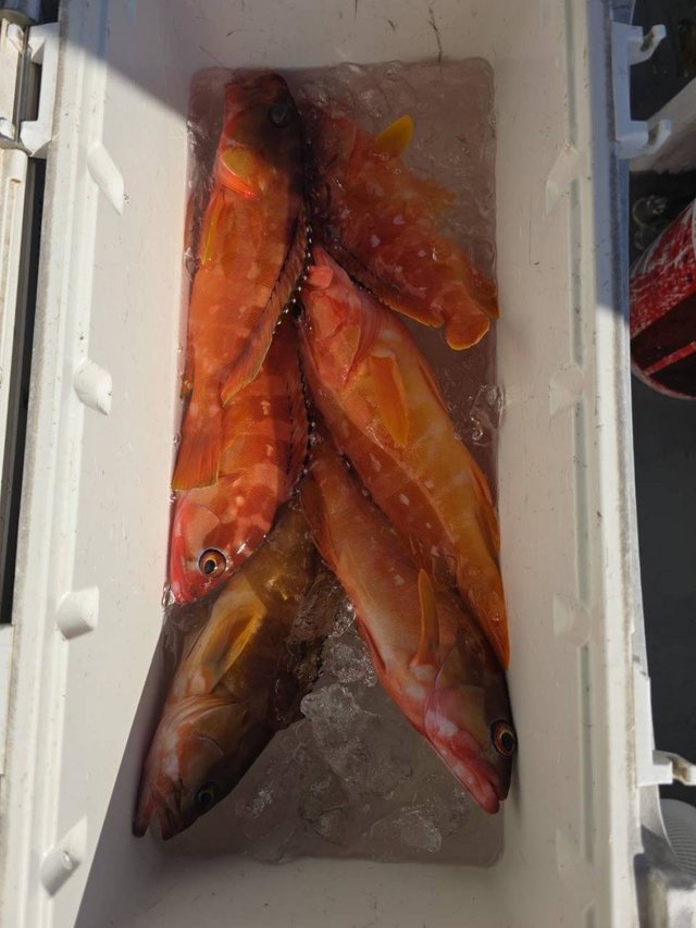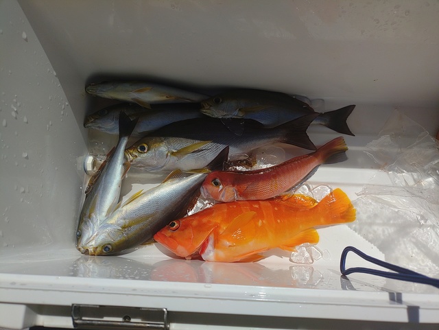 午前泳がせ釣り(イワシ)です。 良型オオモンハタ含み・アカハタ:27~45cmが2~6匹。 全体にポツポツの喰い、バラシもあり。