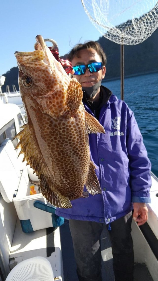 オオモンハタ 最大1.00kg 竿頭5匹 クエ 最大1.60kg ウツボ 午前船。アジ泳がせ。 久しぶりに泳がせ釣りで出船しました。 アタリもあり。 根掛かりもかなりあり。 苦戦しながらも。 他、オオモンハタ小。 仲間で楽しくできました。