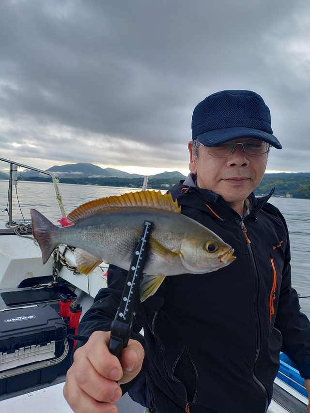 ヒラメ 3.40kg オオモンハタ 合計12匹 アカヤガラ 午前泳がせ釣り(イワシ)。 ヒラメ:1匹3.4kg、 オオモンハタほぼ良型で船中12匹。 他アカハタ・赤ヤガラ。 全体にポツポツ当たり、バラシもあり 青物は残念ながら型ナシ。 オモリ:80号、ハリス:8号~。