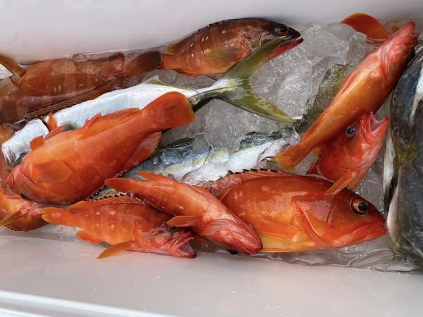 カサゴ オオモンハタ 午前便。アカハタ!top20匹は超えてる!次点15匹位。皆さんこのくらいは釣れたようです。仕掛けは、テンヤ、胴付き、タイラバなどなど色々試してみてください。 結構クーラーは魚で真っ赤でした。 アカハタ狙い!宜しくお願いします。