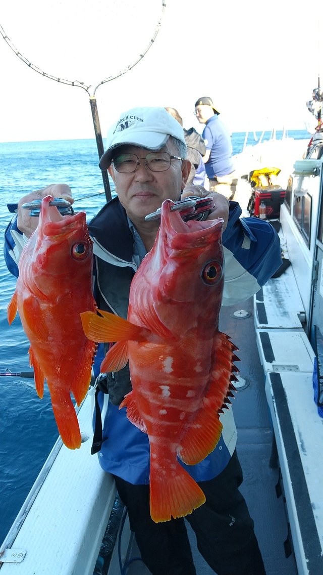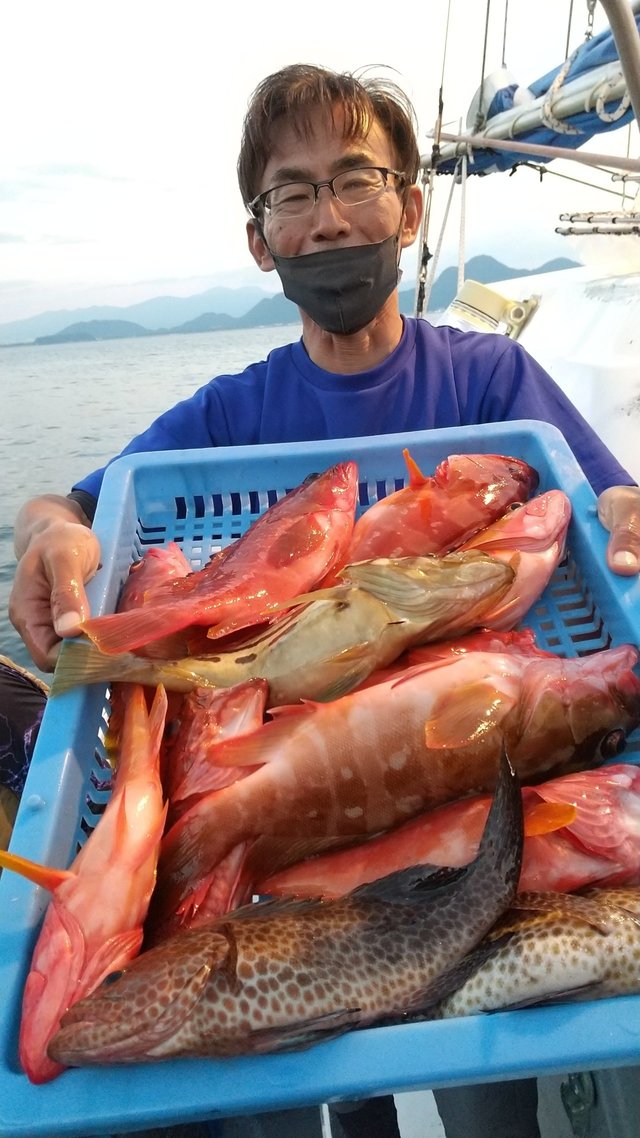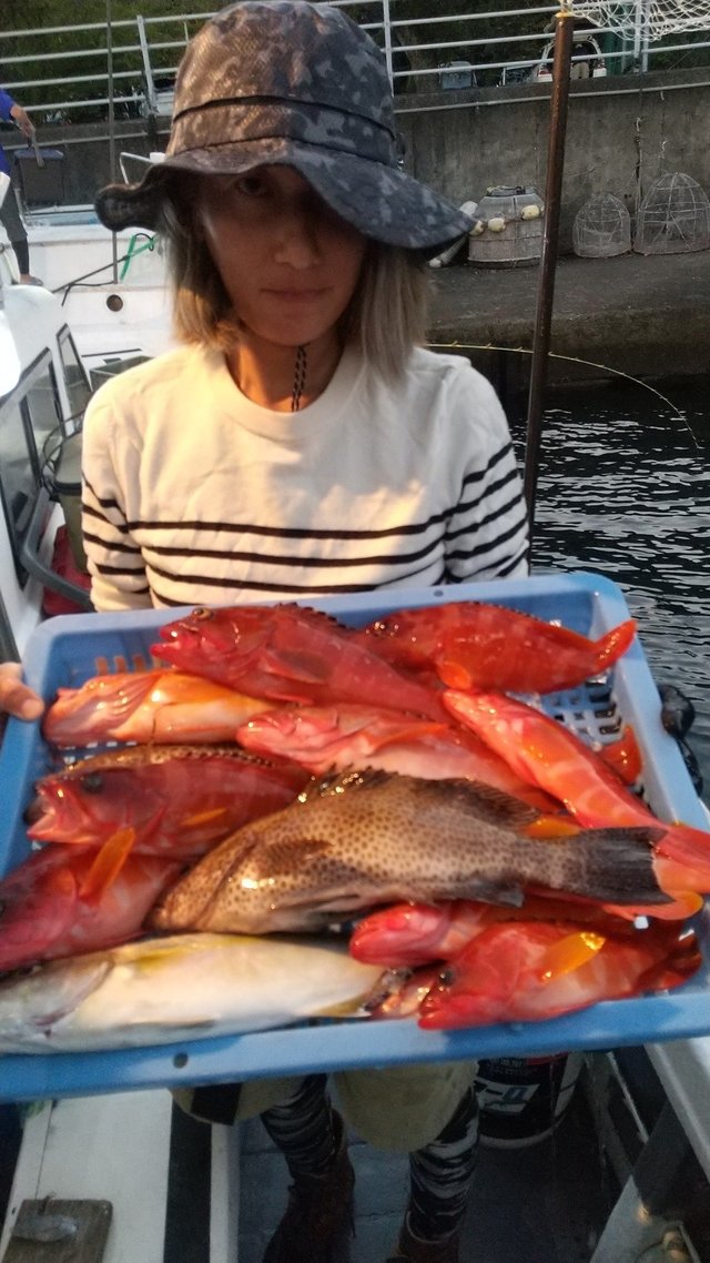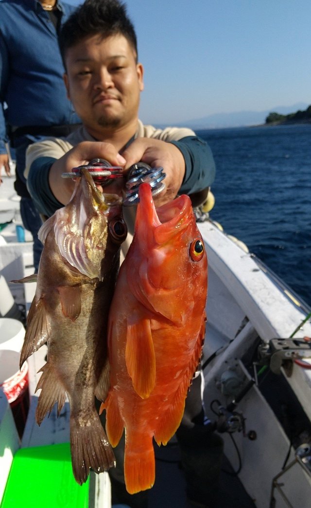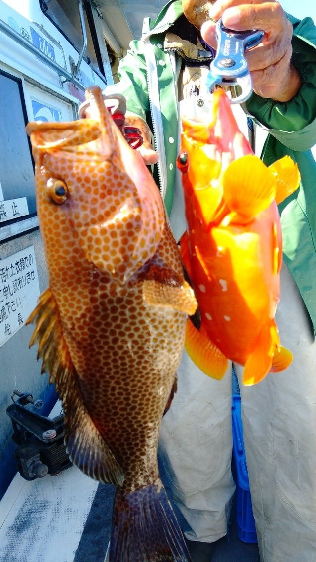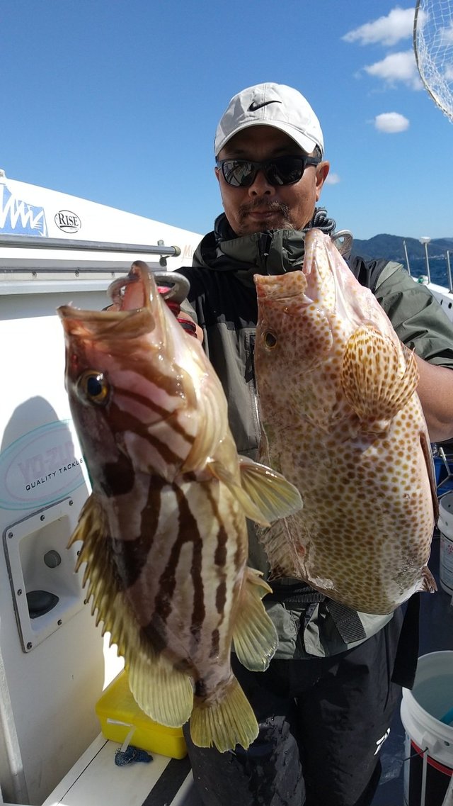 オオモンハタ カサゴ オジサン 午前根魚五目。 アカハタ・オオモンハタ・カサゴ・オジサン等が頭で7匹。 中~小型多かったです。 良型バラシあり、 切り身エサで狙う。ルアー・テンヤも可。