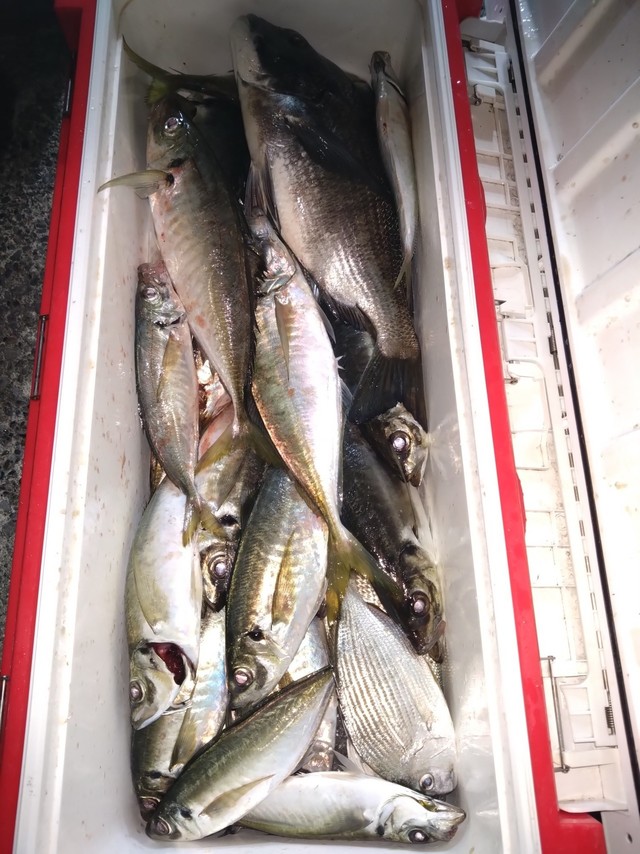 (マアジ)ソーダ 午後便。アジサビキ、皆さん手ぶらで挑戦! サビキ釣りでアジ、ソーダ! とりあえずクーラーは🈵! ありがとうございました。