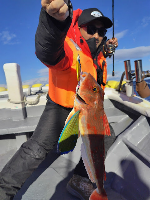 40~48cm 合計4匹 チャリコ(マダイ) 20~35cm 合計5匹 ブリ 80cm 合計1匹 シーバス 70cm 合計1匹 ジガーズ2(J2)にて マダイ五目ジギング マダイ。40。40。43。48。計4匹。 チャリコ。20。25。30。30。35。計5匹 ブリ。 シーバス。 クロソイ。 イナダ。 カサゴ。 ホウボウ。 メジマグロ。(リリース) 【水温】15、9℃ 【水色】澄み 【コメント】反応がたくさんあるが、食い渋い。時合待てなく、強風により早上がりでした。お疲れさまでした。
