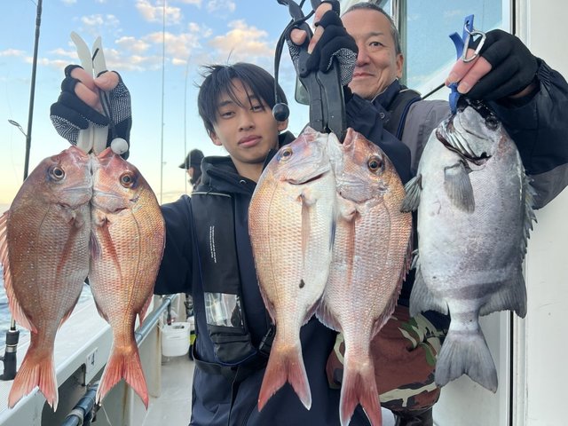 0.40~2.30kg 1~3匹 アジ イナダ クロダイ コマセ真鯛船。 良型のアジやイナダ、クロダイなどに混じって真鯛も当たり、少人数ですがボウズなしでした。 竿が突き刺さるような当たりもありましたがあえなくハリス切れ。バラシもありで楽しめる1日でした。