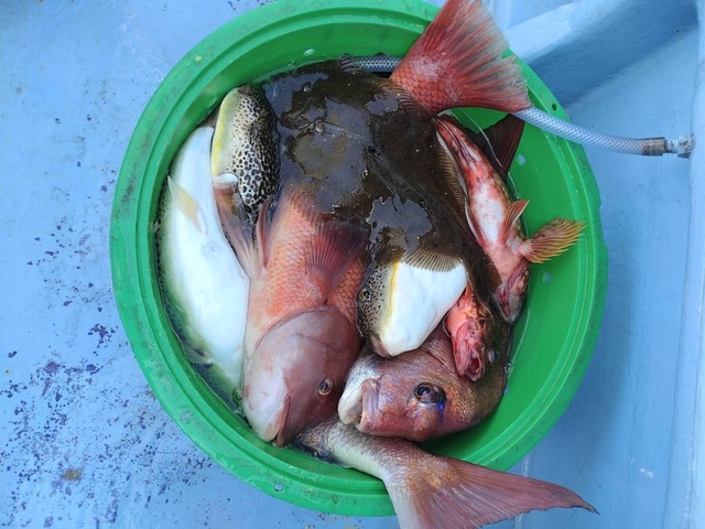 午後テンマキ マダイ、カサゴ、マハタ、イナダ、マダコ、ヒラメなど 前半はマダイ中心に魚っ気ありましたが 暗くなってきてからはさっぱりでした