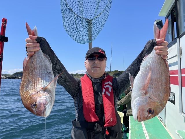 0.50~1.50kg 0~2匹 マダイ 0.80~5.60kg 0~2匹 クロダイ 1.00~2.00kg 0~3匹 軽く2隻隻で出船しました。朝からマダイの顔を見れ、その後はポツポツと拾い釣りでした。トップは2枚!5㎏級の良型乗っ込みマダイも揚りました!ゲストにクロダイ、メジナが交じりました。 オモリは80号 マダイ用ハリス 4~5号8m前後 幅広いハリスをご用意しておいてください。