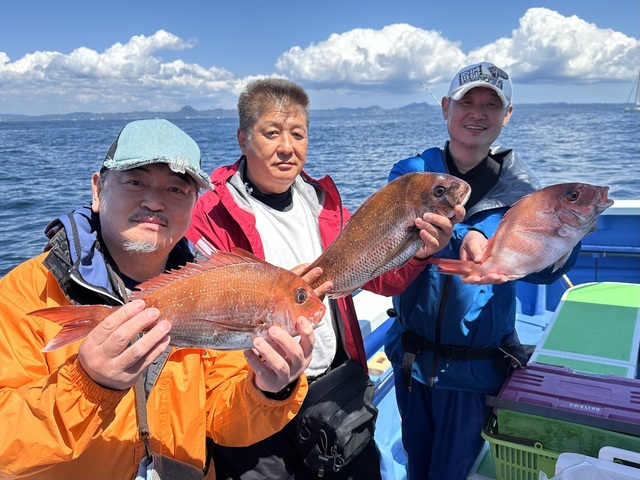 マダイ 0.80~5.10kg 0~2匹 アジ サバ クロダイ イサキ カサゴ マダイ船。 潮色と流れ:薄濁ゆるい。 風向きと強さ:南弱い。 波高:0.5-1.0M。 5.1kg:内田さん。3kg:中野さん。 別船マダイ・1-1.5kg、0-2枚。竿頭:島田さん。 いつもご覧いただきありがとうございます! 連日の大型真鯛ゲット、本日は5.1kgが食いついた!! ノッコミ場の魚群の入りはよく、すぐに1-2kgなどの真鯛が釣れています。 今日は黒鯛・メジナ・イサキなどの魚群が多く回り、もうちょっと真鯛の魚群が回遊して欲しかったところ。 複数枚の黒鯛やメジナは釣れています!まだイサキ釣りシーズンは先になりますが、ノッコミ真鯛場にもイサキの魚群が回ってきていて20-30cmサイズも掛かります。 水深50-60mの真鯛場では大型アジ、中型から大型サバも混じっています。