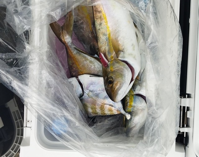 (ブリ)32~46cm 1~8匹 カンパチ シロアマダイ アジ 1~12匹 イナダ五目船。イナダ、カンパチ、シロアマ、大アジなどが釣れました。