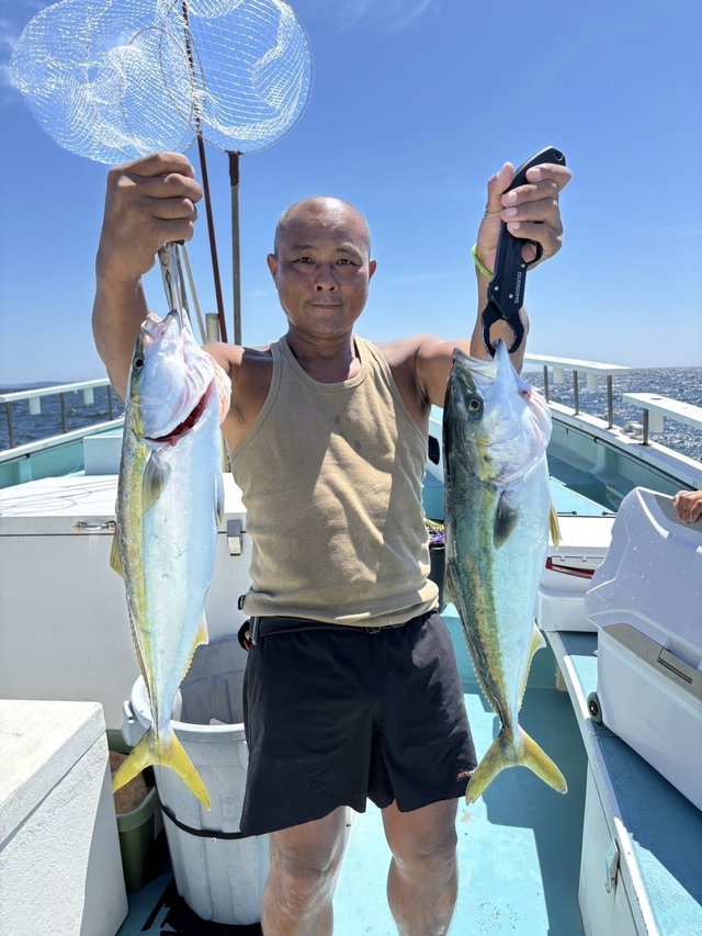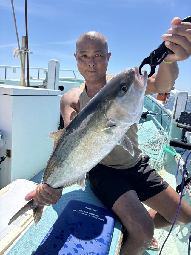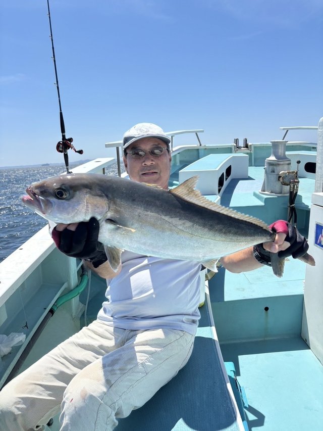 イナダ 37~41cm 0~7匹 アカハタ カサゴ カワハギ アジ シイラ マトウダイ イトヨリ マハタ 今日も、ご乗船有り難う御座いました。 ウルメイワシの大群の中から釣り始めました 落とし込みサビキの仕掛けの方にイナダ、 他アカハタ、カサゴ、カワハギ、アジ、イサキにシイラ。 ポイント移動して大中サバが釣れて皆さん全員楽しんで貰え大中アジもポチポチ交じりの他カイワリメジナにマトウダイ。 一部のお客様がシロアマダイ釣りたいとのリクエストで最後一瞬水深42m落とし良型イトヨリとマハタ、カサゴ。 12時30分になり帰港準備で港へと 釣果イナダ/37〜42cm/0〜7本・アジ・イサキ15〜40cm/7〜34匹・大中サバ4〜12本他。 明日はお盆休みで明後日は通常通りの6時に出船します。
