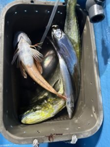 ホンガツオ イナダ ホウボウ カイワリ イトヨリ アマダイ 午前、コマセ五目船。ホンガツオ、イナダ、シイラ、ホウボウ、カイワリ、イトヨリ、アマダイなど。