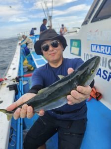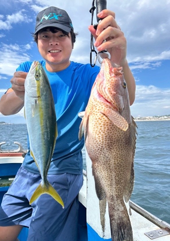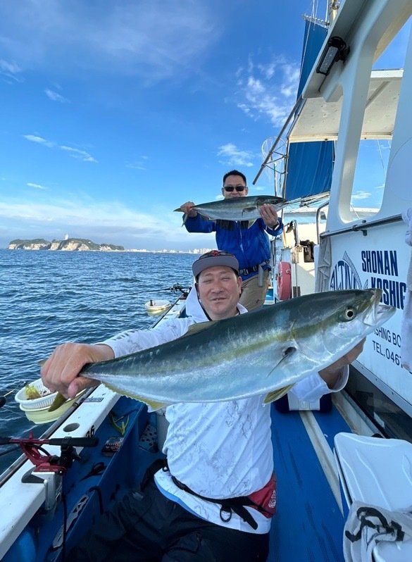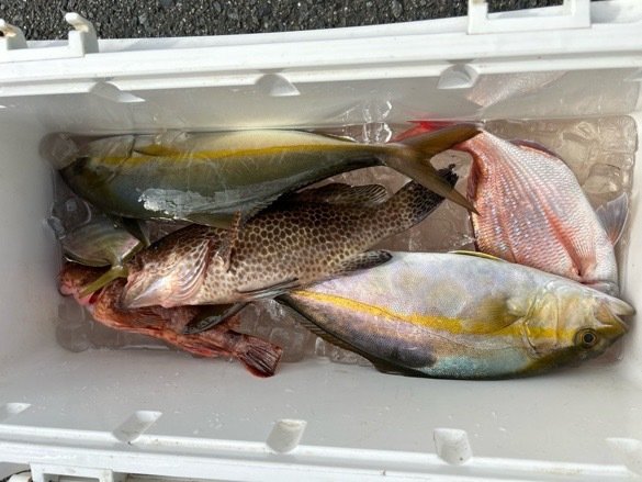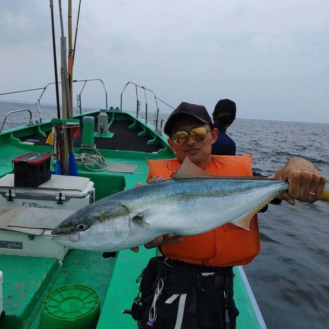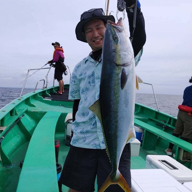 息子船。 SLJに出船しました! 朝一から青物のあたり活発で、5人全員ヒットしたりと、イナダとカンパチでみなさんお土産になりました! クーラーいっぱいのお客様もいてよかったです! 朝から終わりまで誰かしら当たってる状況でしたよ!