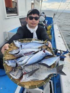 マダイ 0.40~1.30kg 0~1匹 イナダ イトヨリ アジ サバ サワラ ヒラソウダ タイ船、明日は予報悪く出船中止になります、明後日は募集中です。