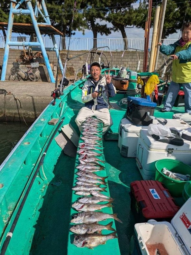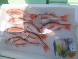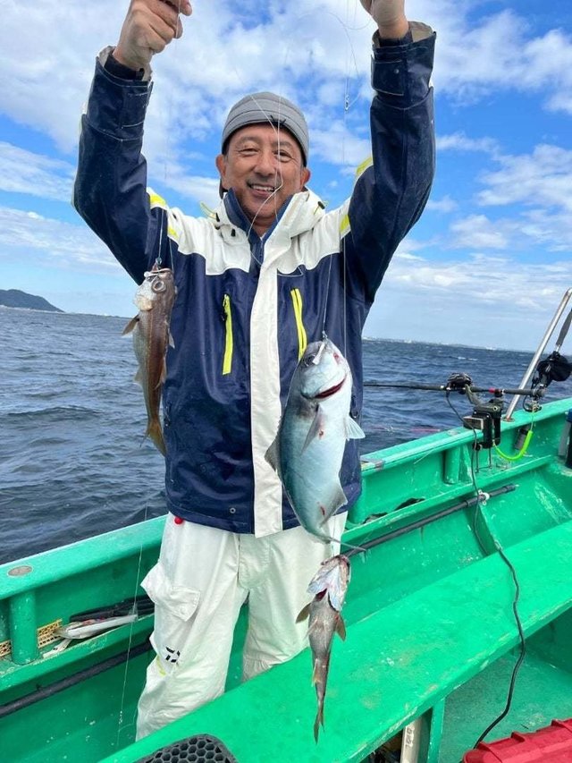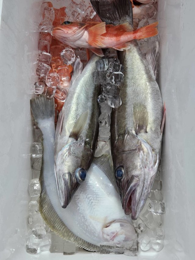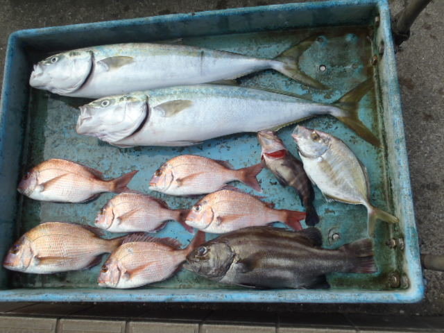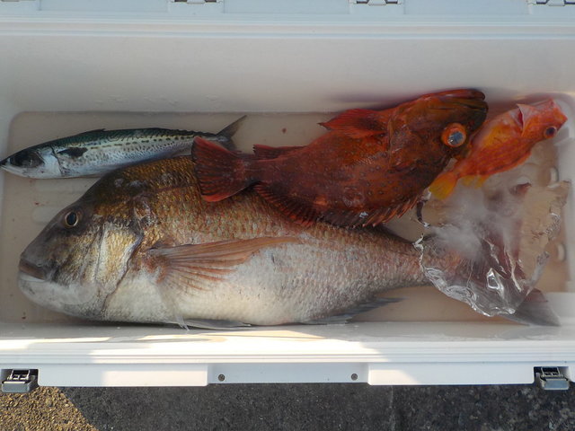 (オオクチイシナギ)アジ サバ カサゴ タイ ソイ メバル マハタ 根魚五目船。 アジ、サバ1人20匹ー45匹くらい(唐揚げ、南蛮漬けに大人気!)。 時化明けの出船でしたが大物根魚ポツリポツリ当たり、バラシもあるものの上がり、お土産になりました!今後も大物狙って出船します!