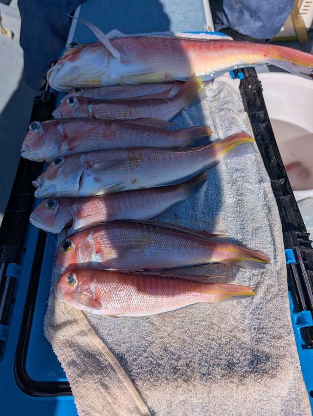 (アカアマダイ)25~35cm 0~3匹 朝は浅場を狙い、イトヨリやトラギスなどが釣れましたが、白甘鯛の姿は見られませんでした。 深場では、甘鯛をはじめ、ヒメコ、キダイ、ホウボウ、トラギス、鯖などが釣れました。