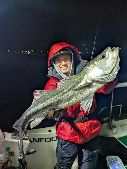 (スズキ)シーバス便、 毎度の常連様釣り納め 最後にいいの釣れましたね。 80アップおめでとうございます。 また来年もよろしくお願いします。 ウェイク145、ダウズスイマー。
