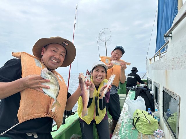 (イトヨリダイ)アオハタ オニカサゴ クロムツ マアジ サバ ソーダガツオ 本船、 今日は青物五目仕立船で出船しました! 潮速くなかなか難しい釣りでしたが 本船は朝泳がせ。 南蛮漬け唐揚げサイズのマアジをおかずに その後は泳がせやりながら他の魚種狙い アオハタ、オニカサゴ、イトヨリ、クロムツ 良型マアジ、サバ、ソーダガツオなど釣れました! 潮が緩ければ良型マアジ もっと釣れそうでしたが残念!! 本日ご乗船の皆様ありがとうございました! またのご乗船をお待ちしております。 明日はおやすみ。 来週は何だかお天気安定しませんね。 来週末頃は落ち着くと思います。 来週、7/18(金)は一日青物五目乗合船で出船確定! 皆様からのご予約をお待ちしております。 ⬛ᥧ8;ショート青物五目乗合は 朝の涼しいうちに釣りをして暑くなる前に戻り 朝は釣り、午後はゆっくりお過ごし出来ます。 また、お子さんが長時間釣りが出来るか心配な方もお試しには丁度良いかと! 1日船とショート船ご予約の際にお申し付けください。 7月も平日、土日共に空席多数! 皆様からのご予約をお待ちしております。 来週以降も空き多数ですので 皆様からのご予約をお待ちしております。 仕立船の募集もしておりますのでご相談ください。 料金、その他はHPのプラン・料金を押してください。 ⬛︎1日青物五目乗合船 7/18(金)、7/20(日)、7/21(月)、 7/26(土)、8/14(木)出船確定! ご乗船お待ちしております。 ⬛︎ショート青物五目乗合船 8/5(火)、8/20(水)出船確定 ご予約をお待ちしております。 ⬛︎スポットLT中深場五目乗合