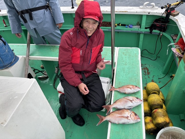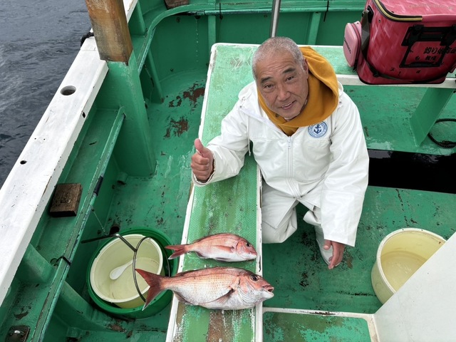 0.30~1.20kg 1~19匹 マダイ 0.30~1.00kg 1~13匹 ★★★活きエビでの一つテンヤマダイ釣り♪★★★ (活き海老エサが準備できない場合は冷凍海老での釣行になります。) エサは、こちらで準備しております。 エサの追加料金は頂いておりません。 <午後マダイ船1> 一つテンヤでのマダイ釣りです。TOP19匹、ついで15匹、11匹、10匹と絶好調!800g前後の良型も混じりで上がってくれました。パターン合わず伸び悩む方もいましたが、皆さん本命が釣れてお土産に♪ 外道:ハナダイ、カサゴ、ウマヅラ、オオニベ、ショゴ。 <午後マダイ船2> 一つテンヤでのマダイ釣りです。派手な上がりは無いがコンスタントに型が見られオデコ無く絶好調!入れ食いでも良い、大きな魚影反応があるがウネリを嫌ったのか素直に口を使わずにポツリポツリといった上がりでした。マダイは数多くいそうなのでウネリが取れ、口を使い出せば爆釣が期待出来そうです!!時化後の出船が楽しみです。 外道:ハナダイ、ヒラメ、ウマヅラ、マハタ。 ***キャビン内、店内はマスクの持参着用をご協力お願い致します*** <今後の予定>***集合時間まえにはお越しください。 午前船:4時30分船宿集合…マダイ船。 午後船:10時30分船宿集合…マダイ船。 定休日:第2火曜日(1/13) (土、日、祝日は、貸竿のお客様、貸竿の必要なグループ様は5分前集合でお願い致します。) (*状況により予定が変わることもございます。前日に確認のお電話をお願い致します。) <ご予約・お問い合わせはこちらへ> 090-2155-0500(午前9:00~午後8:00まで) キャンセルにより他のお客様へご迷惑をおかけしてしまう事もありますので、キャンセルの無いようご予約をお願い致します。 <乗船名簿について> ①お名前(フルネーム)、②住所、③緊急連絡先の電話番号、④年齢、⑤性別 ①~⑤まで記入し可能であれば、持参お願い致します。