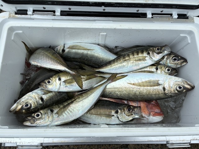 アジ 息子船。マダイ釣りに出船しました! 朝いちから当たりアジ混じりでお土産になりました!ダブルヒットなどでマダイ浮上場面もありました!