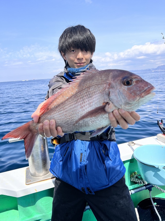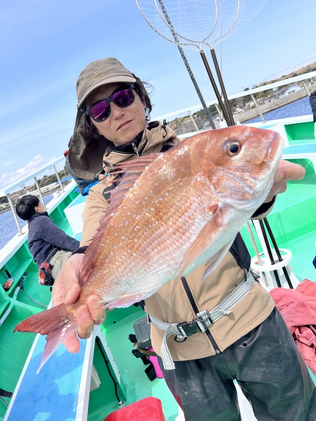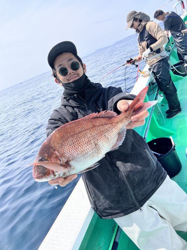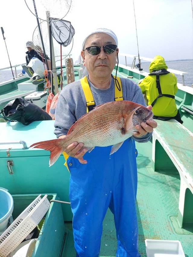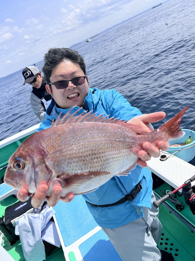 マダイ船。 潮色と流れ:薄濁ゆるい。 風向きと強さ:北東弱い→南-。 波高:0-0.5M。 マダイ2.2kg:原田さん。 いつもご覧いただきありがとうございます! 真鯛は最大2.2kgをゲット! アジ釣りは魚群がよく入り、初心者の方にも20-40cmサイズの大型アジが釣れて、アジと黒鯛の一荷釣りもありました(^^) 本日のアジは30-40cmが多めに釣れています。 泳がせにはマトウダイがヒット。
