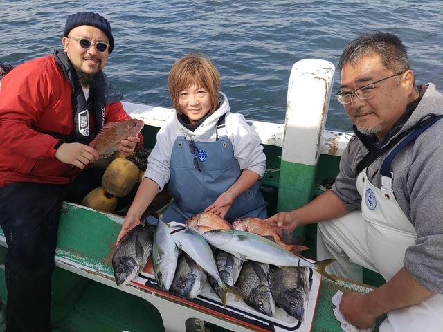 0.50~1.60kg 2~6匹 イナダ カンパチ クロダイ 今日は、朝からマダイはポツポツと釣れバラシも多数有りましたが皆さん釣る事が出来ました。他カンパ、クロダイ、イナダ混じり釣れました。明。
