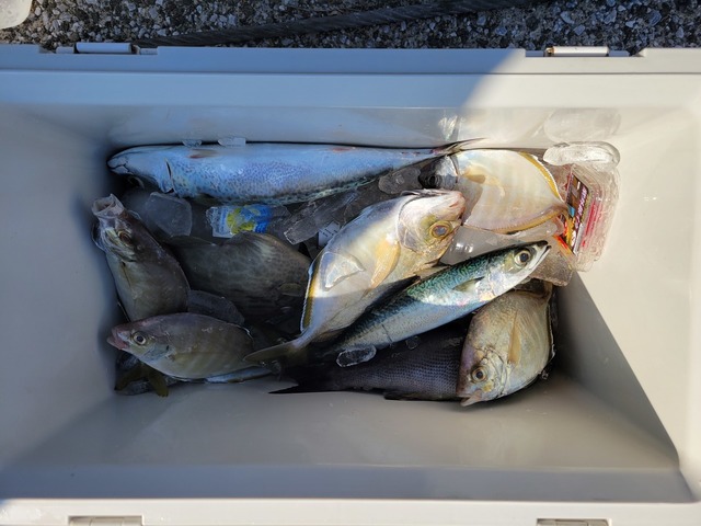 (マサバ)アジ イトヨリ カイワリ ソウダガツオ コマセ五目船です。朝から入れポンTIMEあり! アジ、サバ、イトヨリ、カイワリ、ソウダガツオ 入れ物満タンでした! オモリ80号コマセカゴのサイズはFLまで