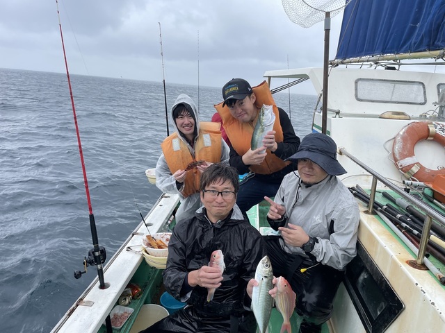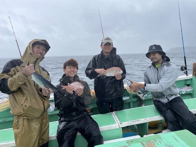 (マサバ)25~33cm 2~10匹 ハナダイ 0.50~0.80kg 0~2匹 ウィリーアマダイ五目ハナダイ0.5~0.8㎏0~2枚イトヨリ23~35㎝0~2枚ソーダ25~30㎝2~5匹サバ25~33㎝2~10匹アジ本ガツオEtc ターゲットのハナダイイナダアマダイイトヨリと顔を見ることは出来ましたが根魚はウネリの影響か数は伸びませんでしたそれでも本ガツオサバソーダとお土産はキープで帰港です! チャーター船 本ガツオソーダサバハナダイEtcと小雨混じりのコンデションが今一つのなか皆さん頑張ってくれてお土産キープで良かったです!